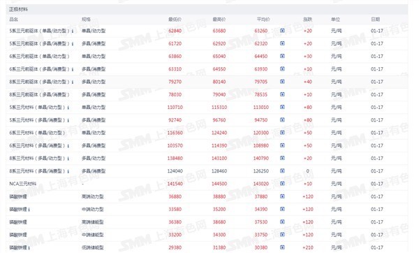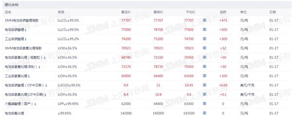 证券之星新能源车行业周报:据上海有色网,截止1月17日,电池级碳酸锂7.70-7.87万元/吨,均价7.785万元/吨,环比上一工作日上涨500元/吨;工业级碳酸锂7.42-7.52万元/吨,均价7.47万元/吨,环比上一工作日上涨500元/吨。本周碳酸锂现货价格涨幅已超2000元/吨。当前由于部分下游材料厂仍处于春节前采购备库阶段,带动碳酸锂现货市场成交情况仍相对活跃。相对积极的询价采购行为拉动上游锂盐厂及贸易商挺价抬价心态,今日碳酸锂现货成交价格重心持续上移。考虑物流发运等情况,本周将是碳酸锂采购的最后时间节点,预计下周碳酸锂现货价格将维稳为主,同时伴有区间震荡。