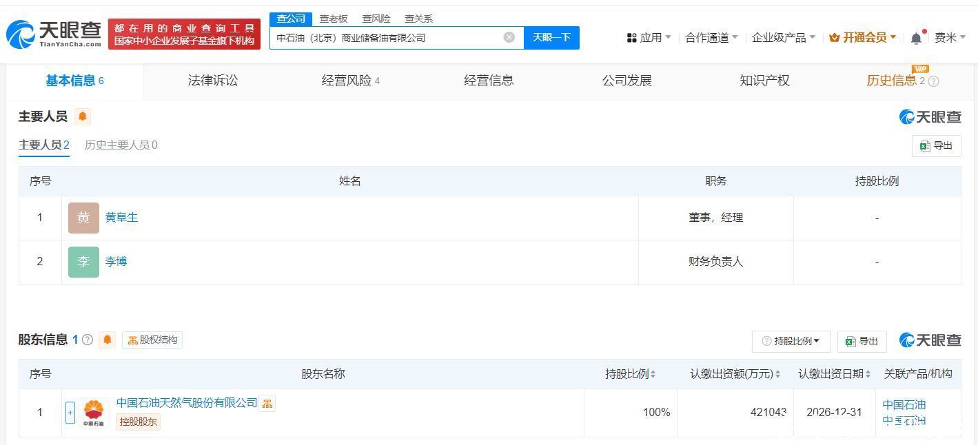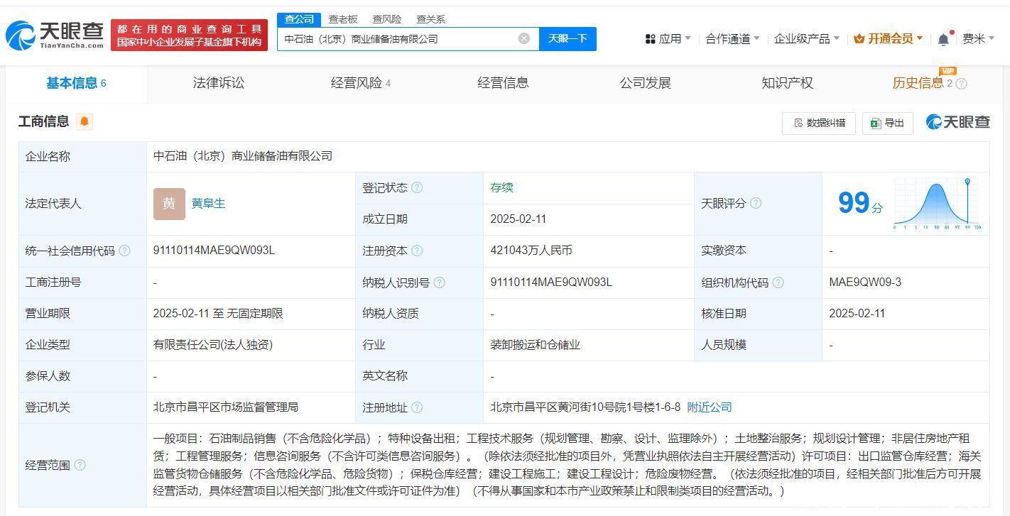 天眼查App显示,近日,中石油(北京)商业储备油有限公司成立,法定代表人为黄阜生,注册资本约42.1亿人民币,经营范围含石油制品销售、特种设备出租、工程技术服务、土地整治服务、规划设计管理、非居住房地产租赁等。股东信息显示,该公司由中国石油(601857)全资持股。