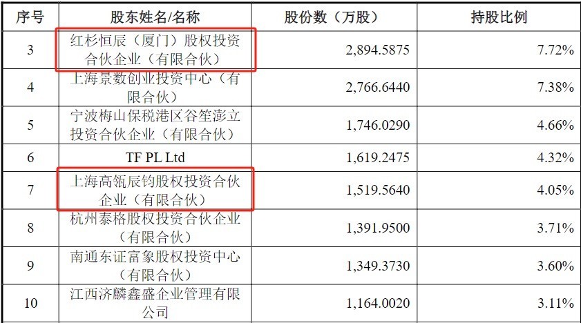 公告显示,红杉恒辰直接持有公司7.72%的股份,为公司第三大股东;高瓴辰钧以4.05%的持股,位居公司第七大股东。高瓴辰钧、高瓴祈睿、高瓴梁恒合计持有公司6.32%的股份。